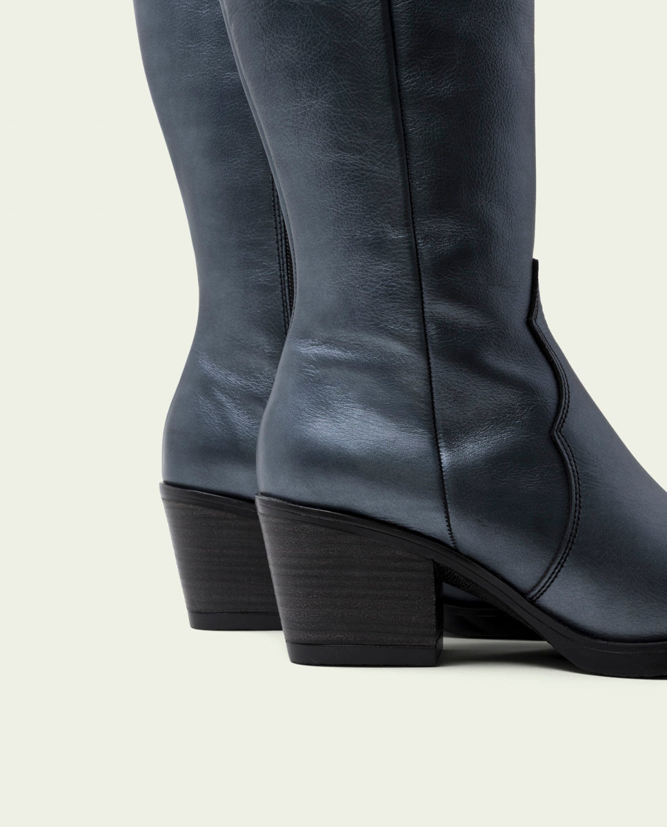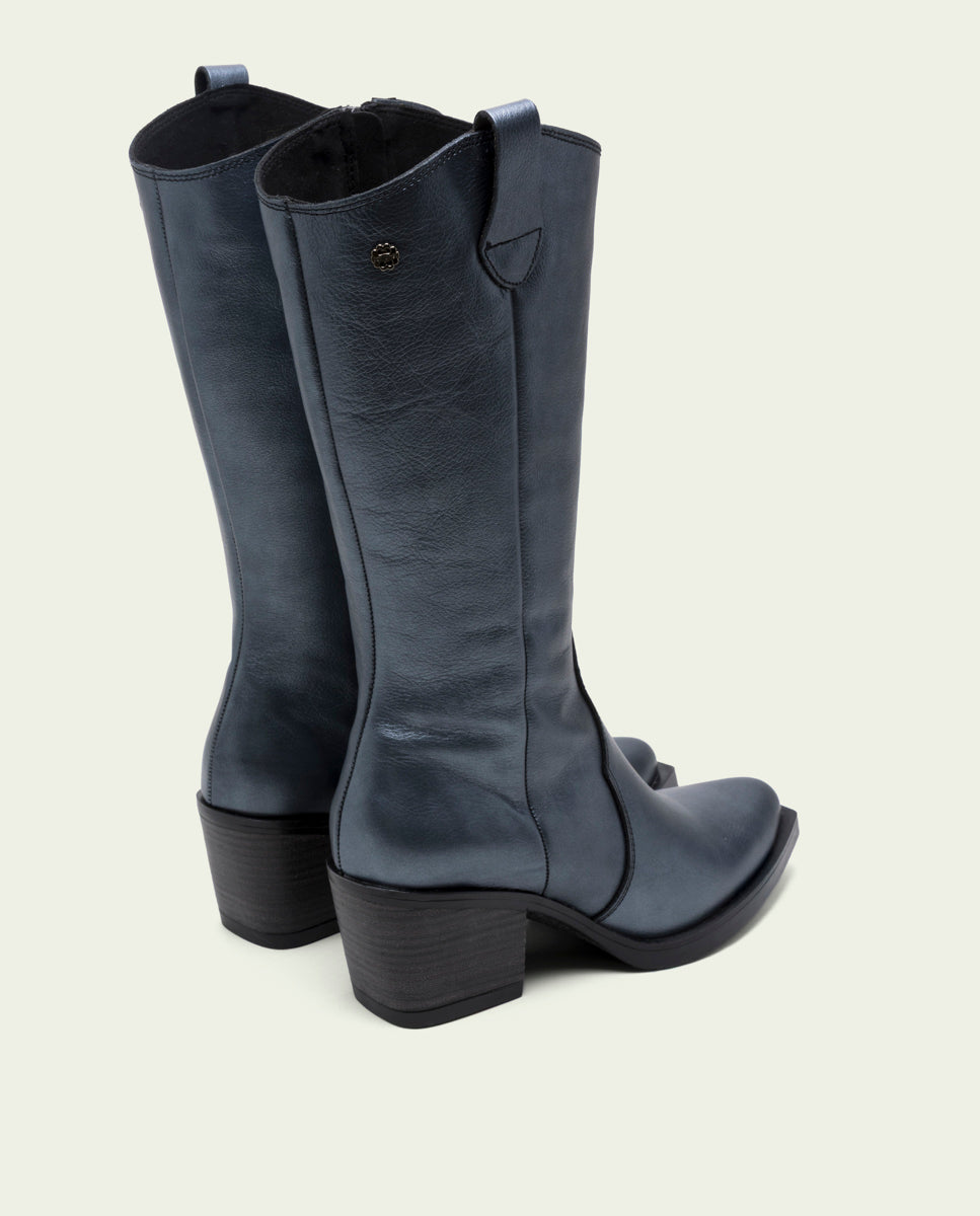 Botas estilo cowboy de piel con acabado metalizado, tacón de 6,5 cm y plataforma de 1 cm. Apertura lateral con cremallera interior y tiradores laterales para facilitar el calce. Plantilla y forro de microfibra con acabado confort aterciopelado. Piso antideslizante y flexible. Elaborado 100% en España.