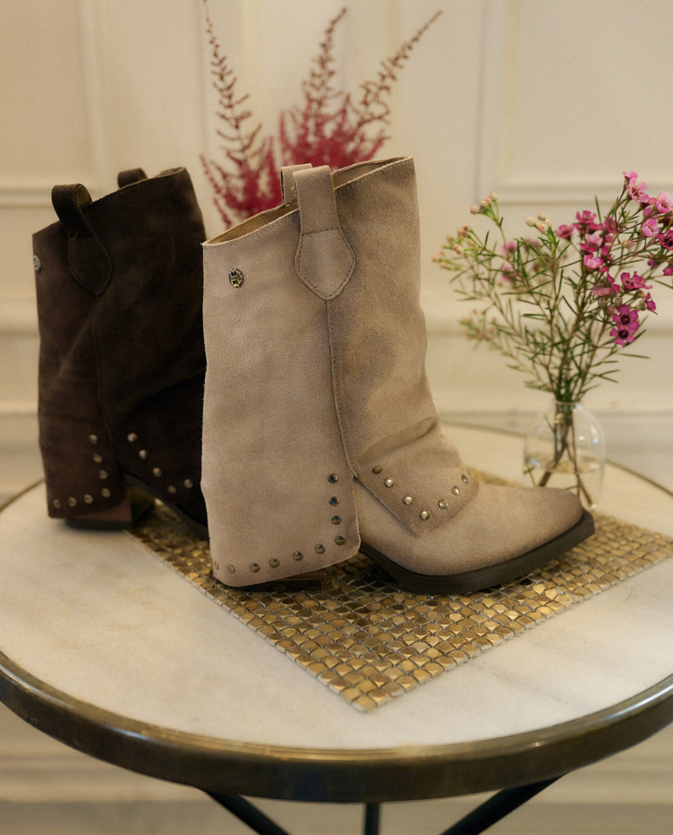 Botas doble faz estilo cowboy de piel con tacón de 6,5 cm y plataforma de 1 cm. Adorno de tachuelas metálicas en el borde. Tiradores laterales para facilitar el calce. Plantilla y forro de microfibra con acabado confort aterciopelado. Piso antideslizante y flexible. Elaborado 100% en España.