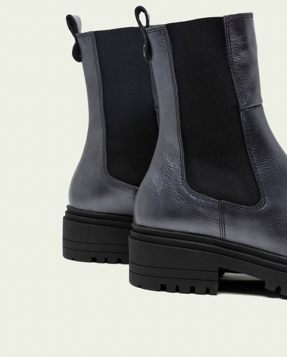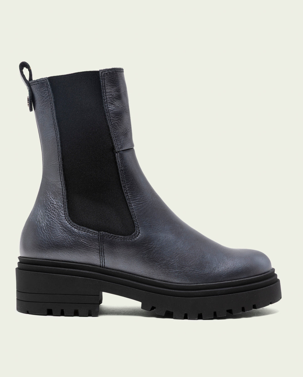 Botines de piel metalizada estilo chelsea con elásticos. Elásticos laterales para facilitar el calce. Plantilla y forro de microfibra con acabado confort aterciopelado. Piso antideslizante y flexible con altura de tacón de 5 cm. Elaborado 100% de manera artesanal en España.