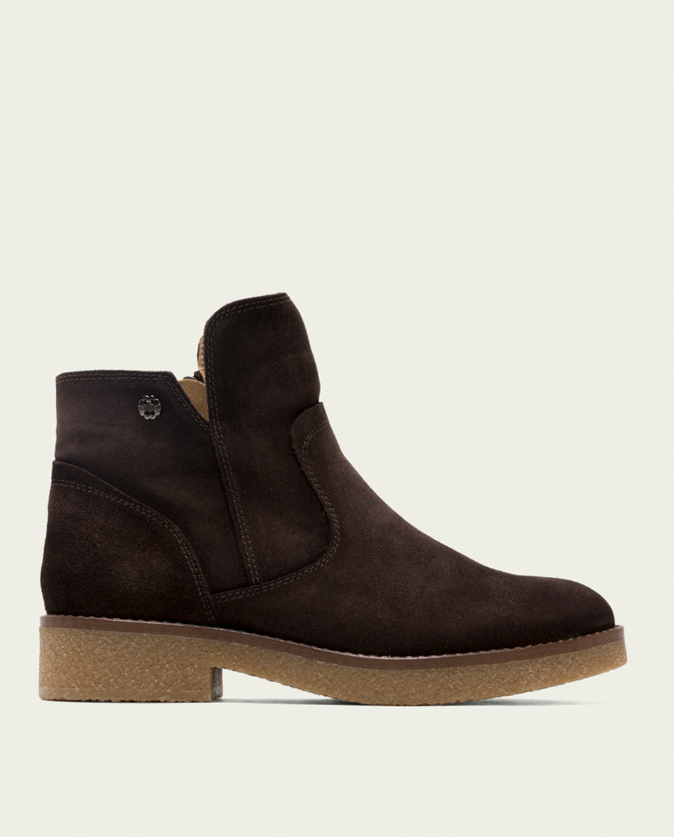 Botines de serraje con suela de crepé natural y altura de tacón de 3,5 cm. Apertura interior con cremallera para facilitar el calce. Corte de piel, forro y plantilla de microfibra confort aterciopelada. Elaborado 100% en España.
