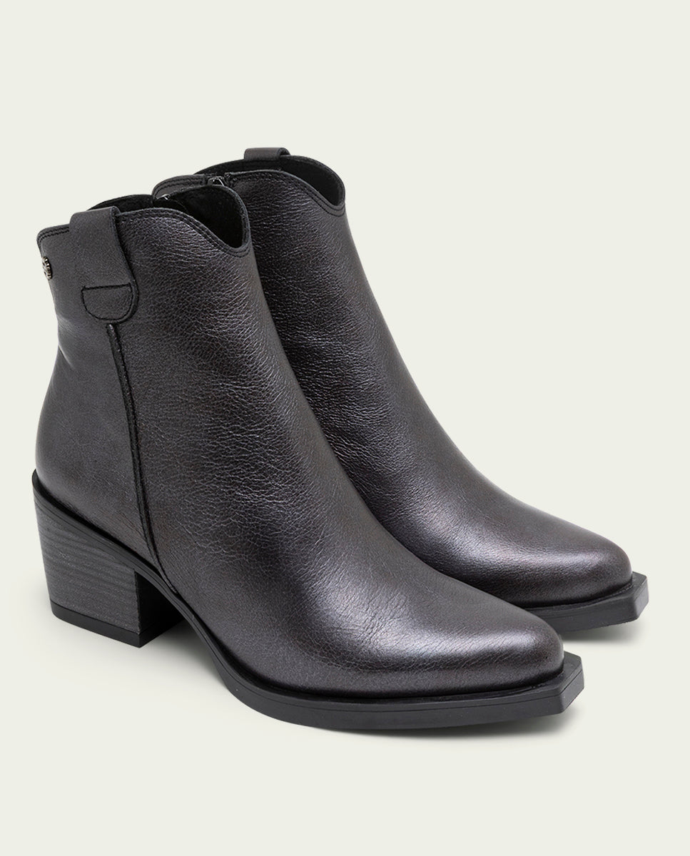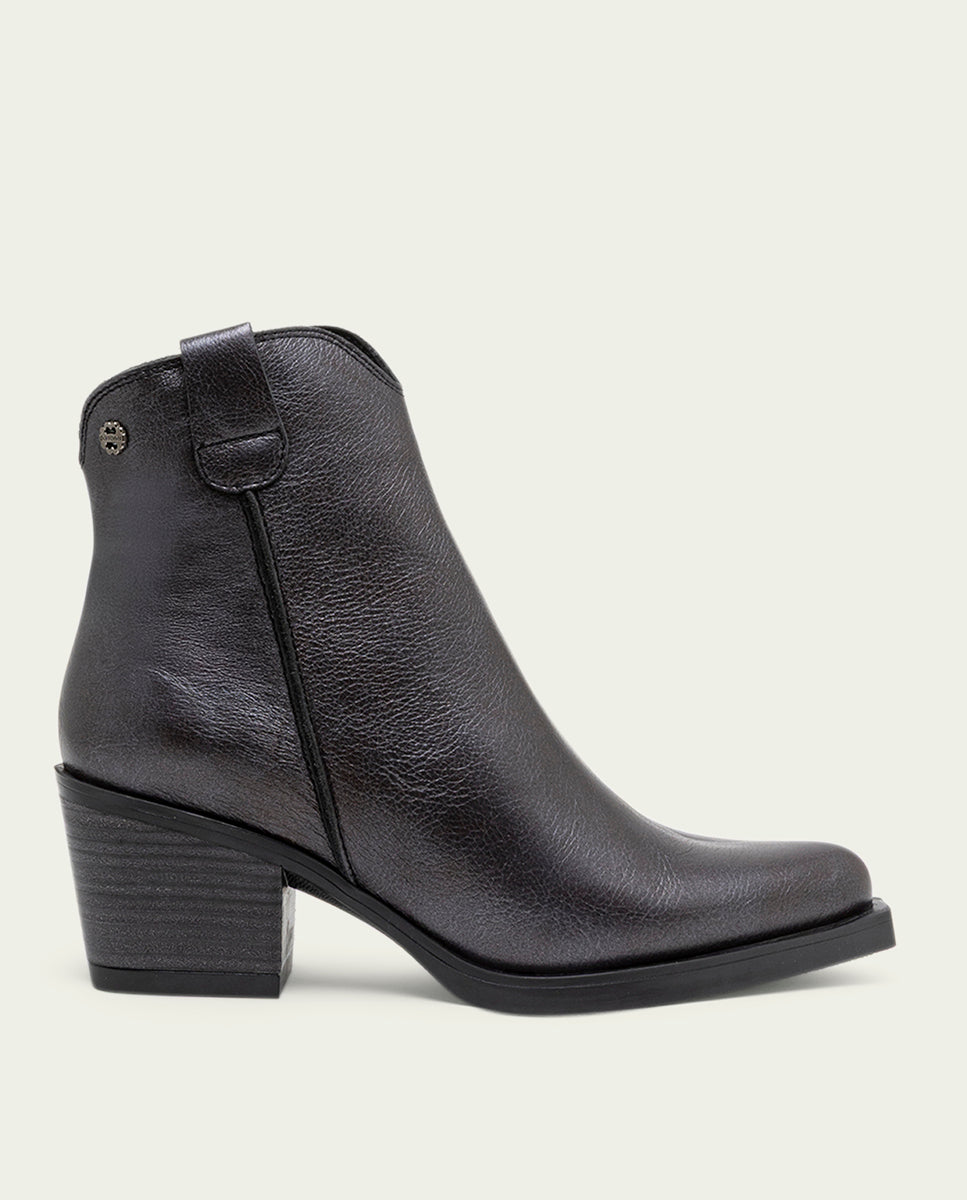 Botines estilo cowboy de piel con acabado metalizado, tacón de 6,5 cm y plataforma de 1 cm. Apertura lateral con cremallera interior y tiradores laterales para facilitar el calce. Plantilla y forro de microfibra con acabado confort aterciopelado. Piso antideslizante y flexible. Elaborado 100% en España.