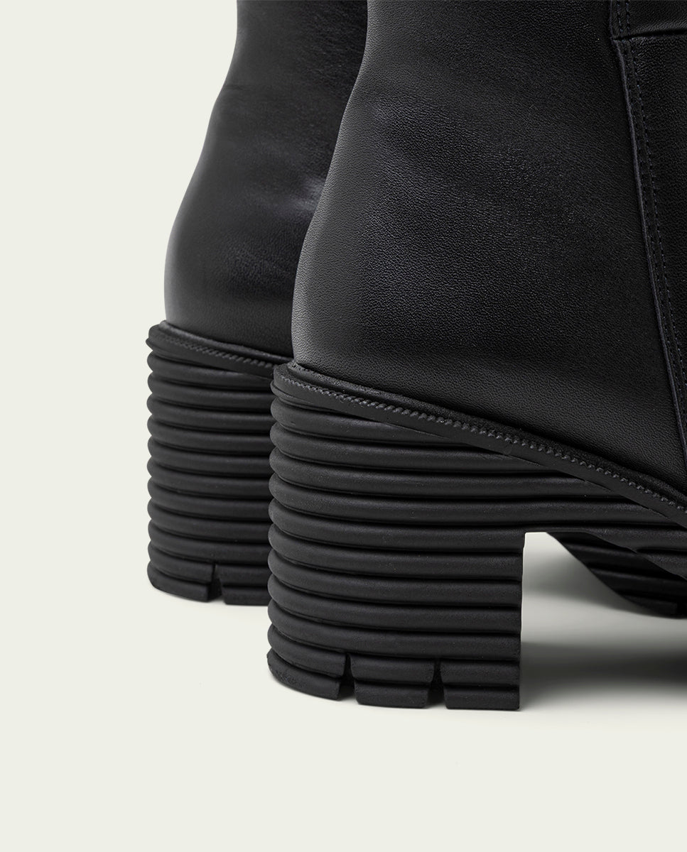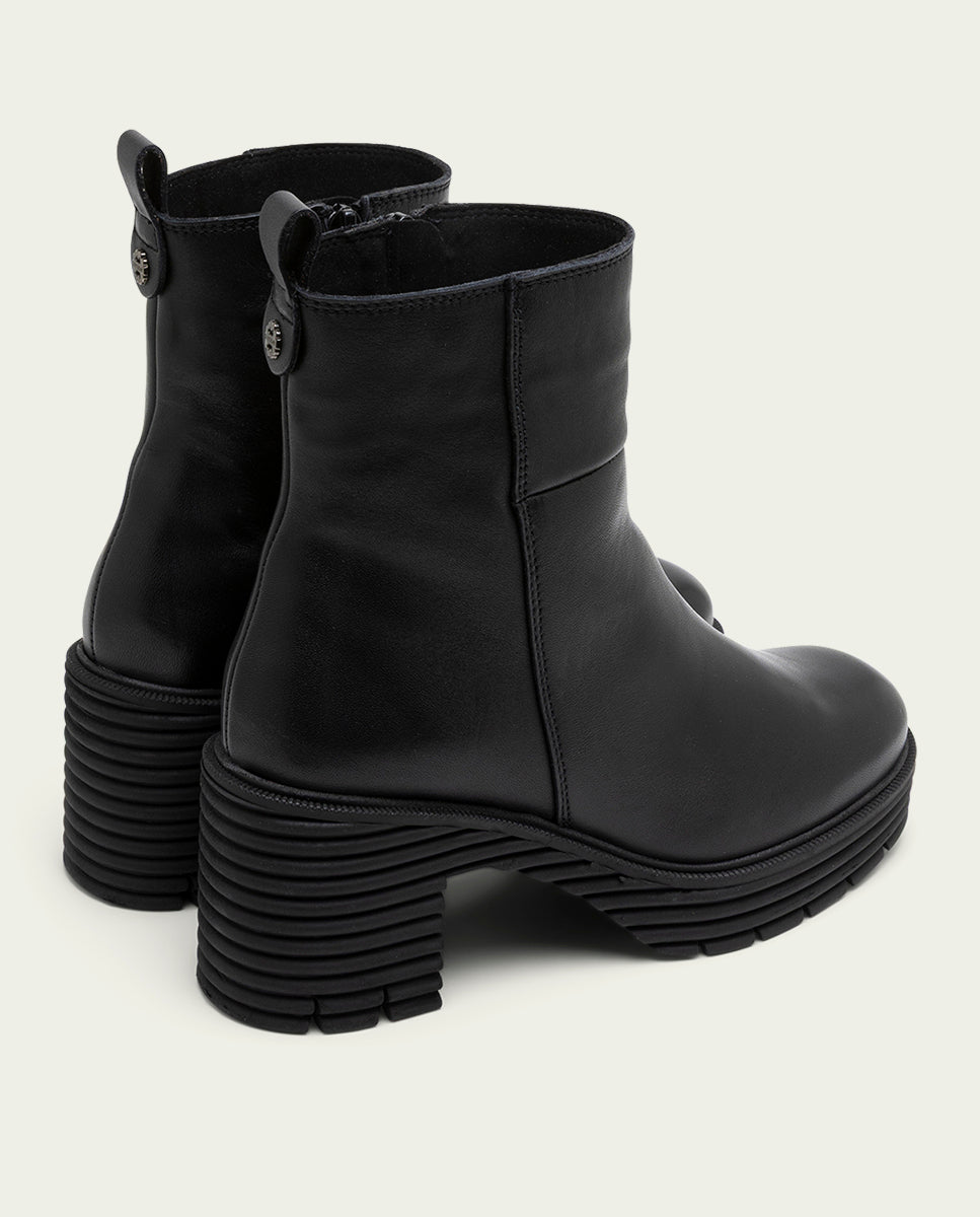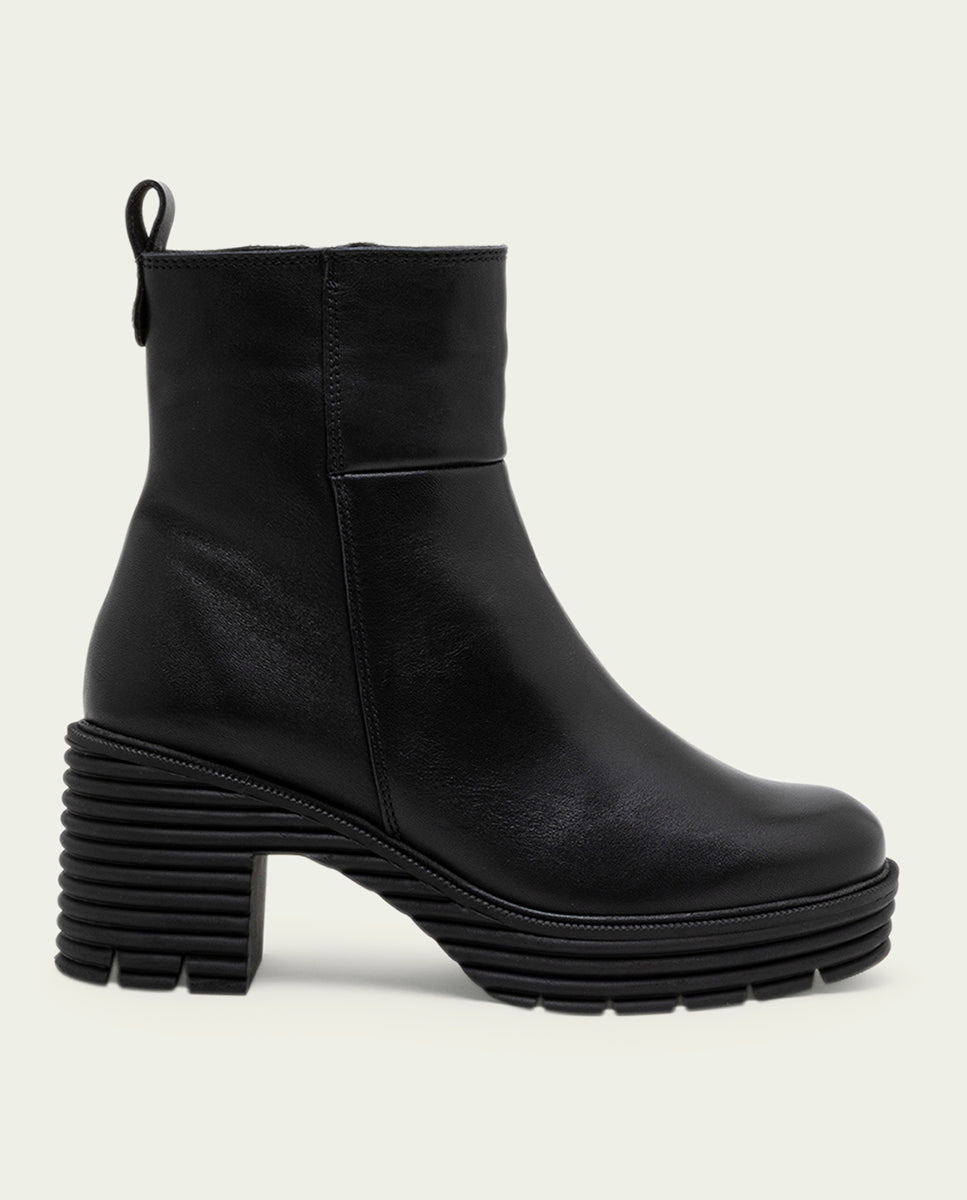 Botines de piel con piso track con tacón de 6,5 cm y plataforma de 2,5 cm. Cremallera lateral interior para facilitar el calce. Plantilla y forro de microfibra con acabado confort aterciopelado. Elaborado 100% en España.