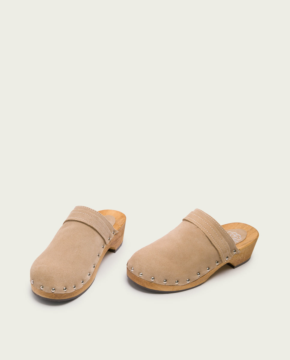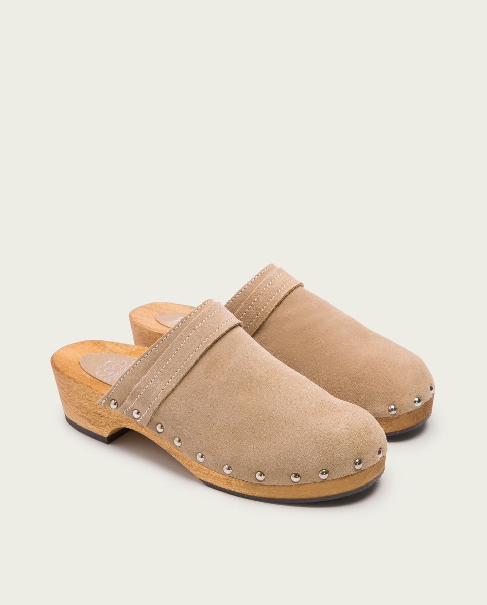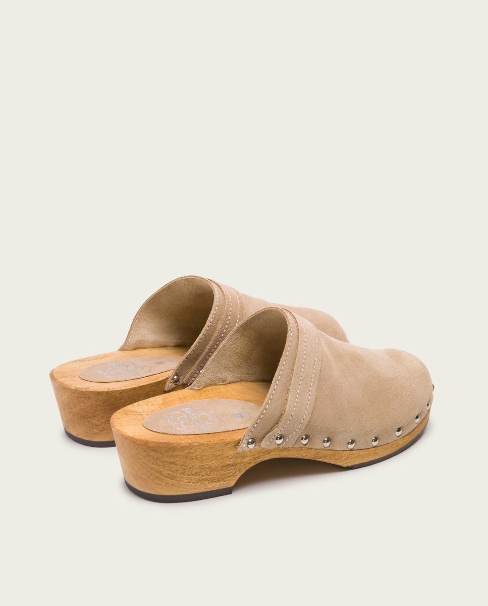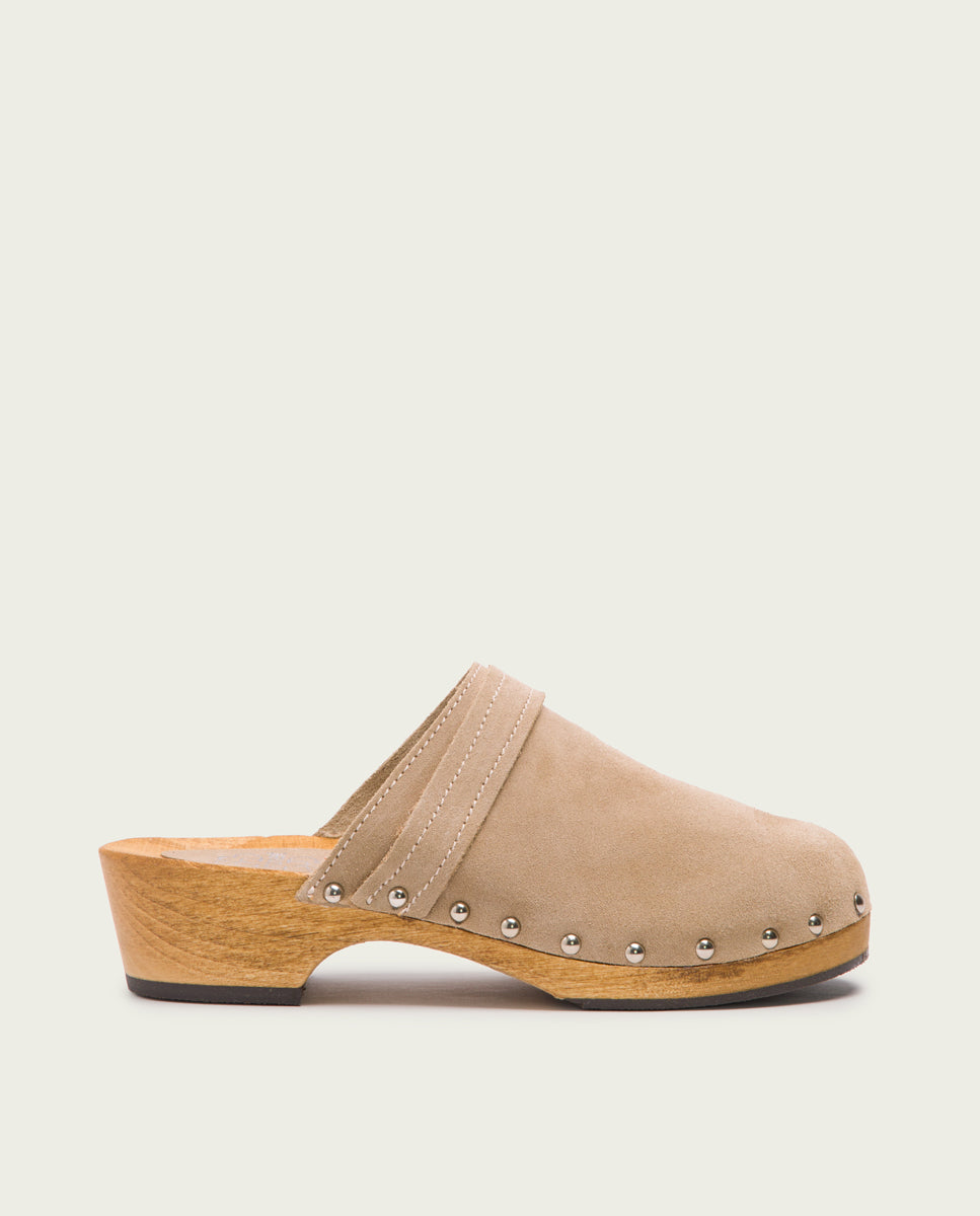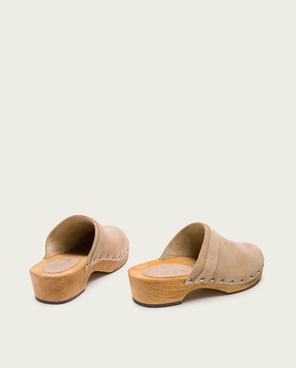 Sandalias de serraje tipo zueco de color arena con 4cm de tacón y 2 cm de plataforma. Piso de madera natural con detalles de tachas y suela de goma antideslizante.
