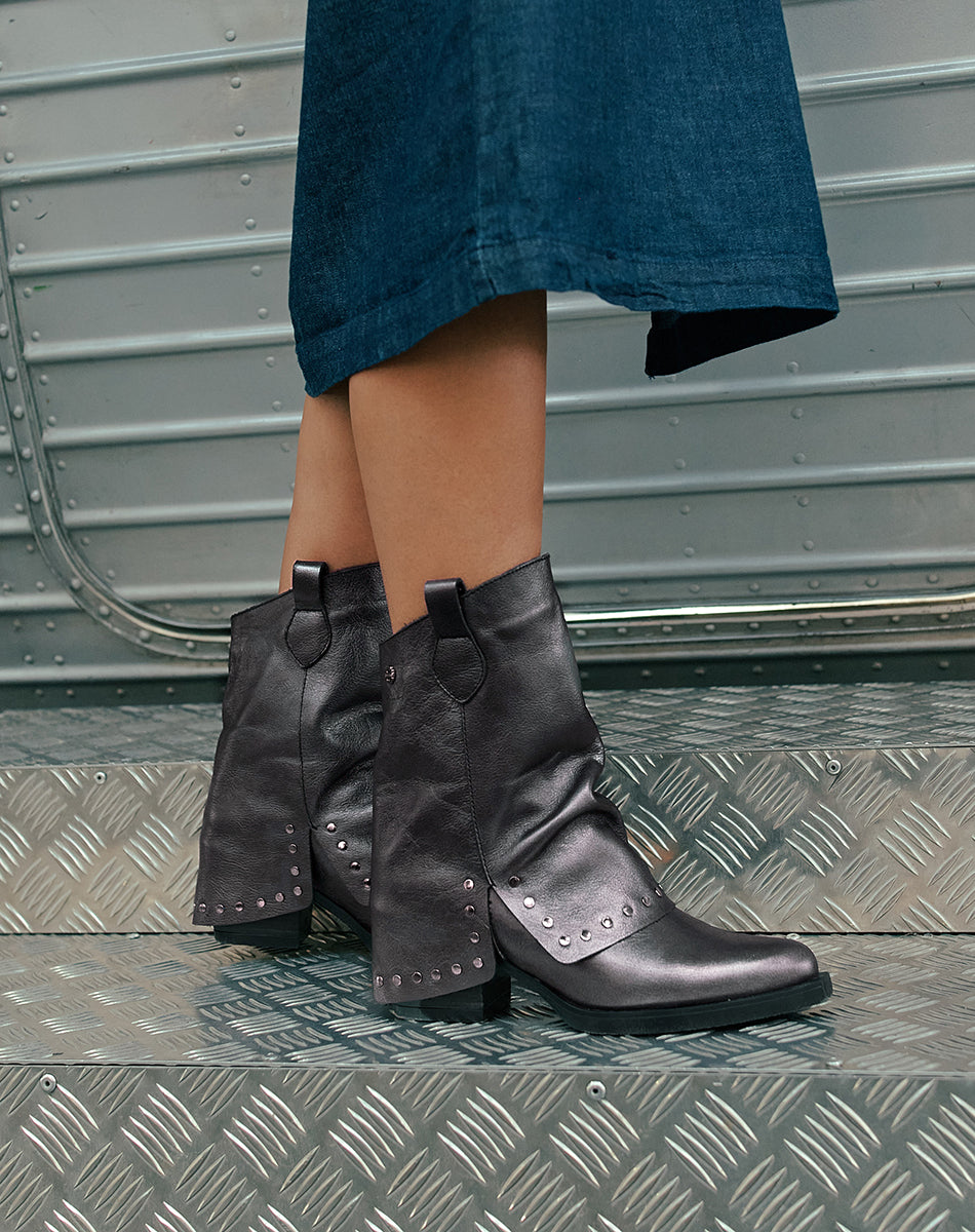 Botas estilo cowboy con doble faz de piel, adornadas con tachuelas metálicas. Tacón de 6,5 cm y plataforma de 1 cm. Tiradores laterales para facilitar el calce. Plantilla y forro de microfibra con acabado confort aterciopelado. Piso antideslizante y flexible. Elaborado 100% en España.