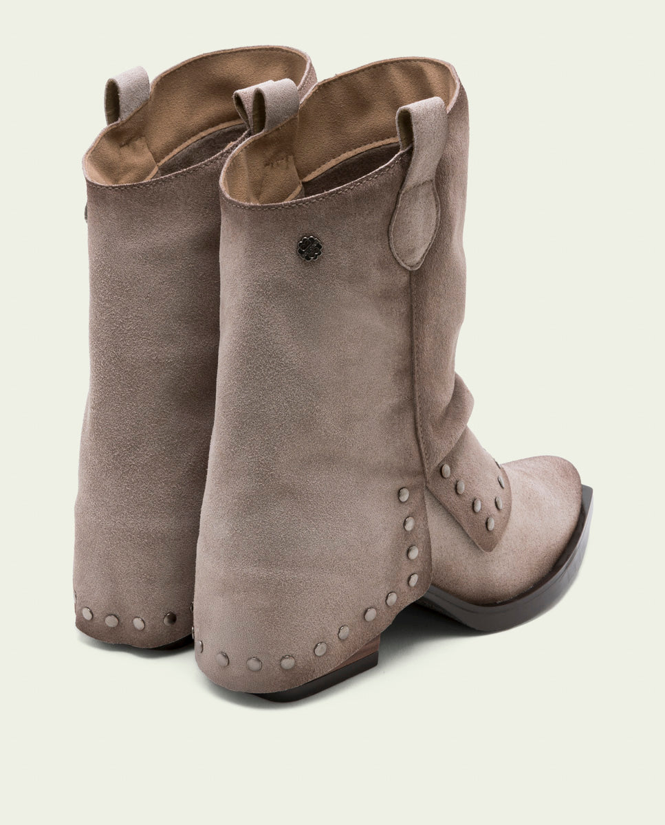 Botas doble faz estilo cowboy de piel con tacón de 6,5 cm y plataforma de 1 cm. Adorno de tachuelas metálicas en el borde. Tiradores laterales para facilitar el calce. Plantilla y forro de microfibra con acabado confort aterciopelado. Piso antideslizante y flexible. Elaborado 100% en España.