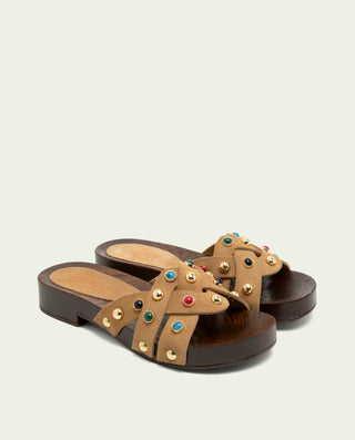 Nuestras sandalias están realizadas en materiales naturales como la piel, serrajes, madera o corcho y en diferentes colores, centrada en tonos tierra, taupes y crudos. Tienen toques pastel, rosa o amarillo, y trenzados tipo yute.