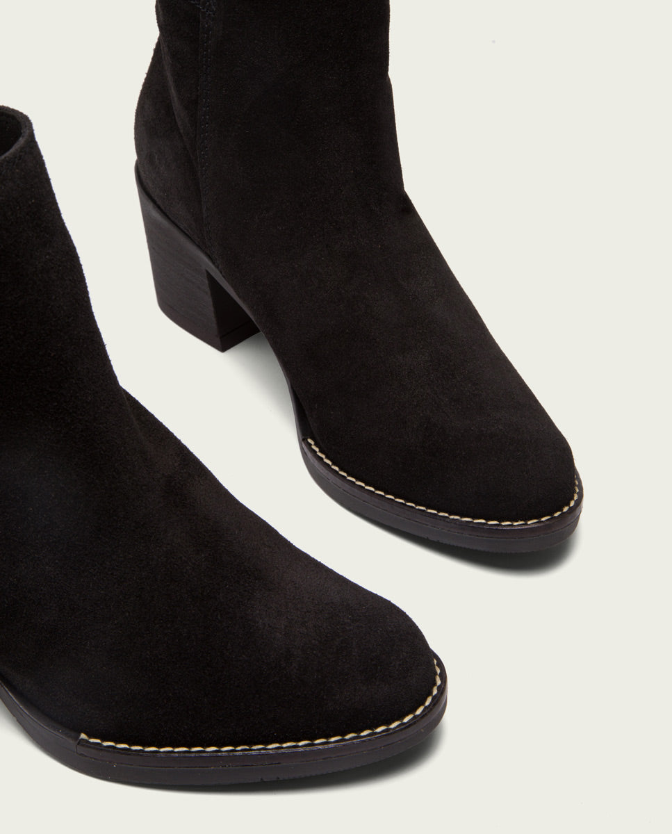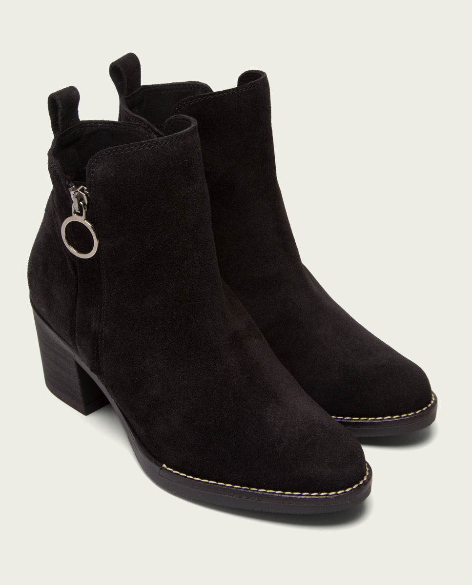 Botines de serraje con tacón de 6,5 cm. Cremallera lateral exterior con tirador de anilla y detalle de tirador en la parte trasera para facilitar el calce. Plantilla y forro de microfibra con acabado confort aterciopelado. Elaborado 100% en España.