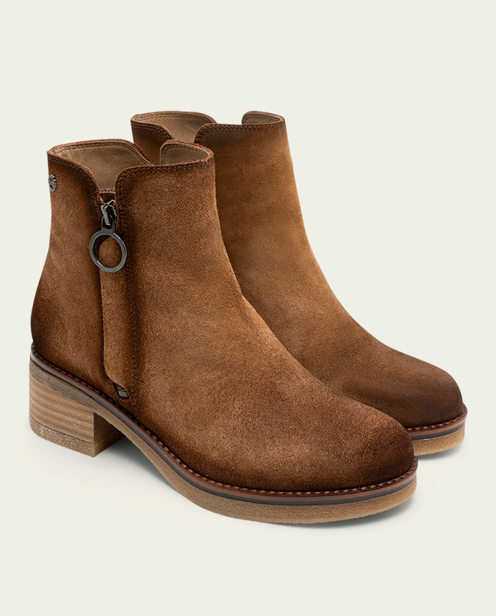 Botines de serraje con tacón de 5 cm y plataforma de 2 cm. Apertura lateral exterior con cremallera y tirador con anilla. Plantilla y forro de microfibra con acabado confort aterciopelado. Piso antideslizante y flexible. Elaborados 100% en España.