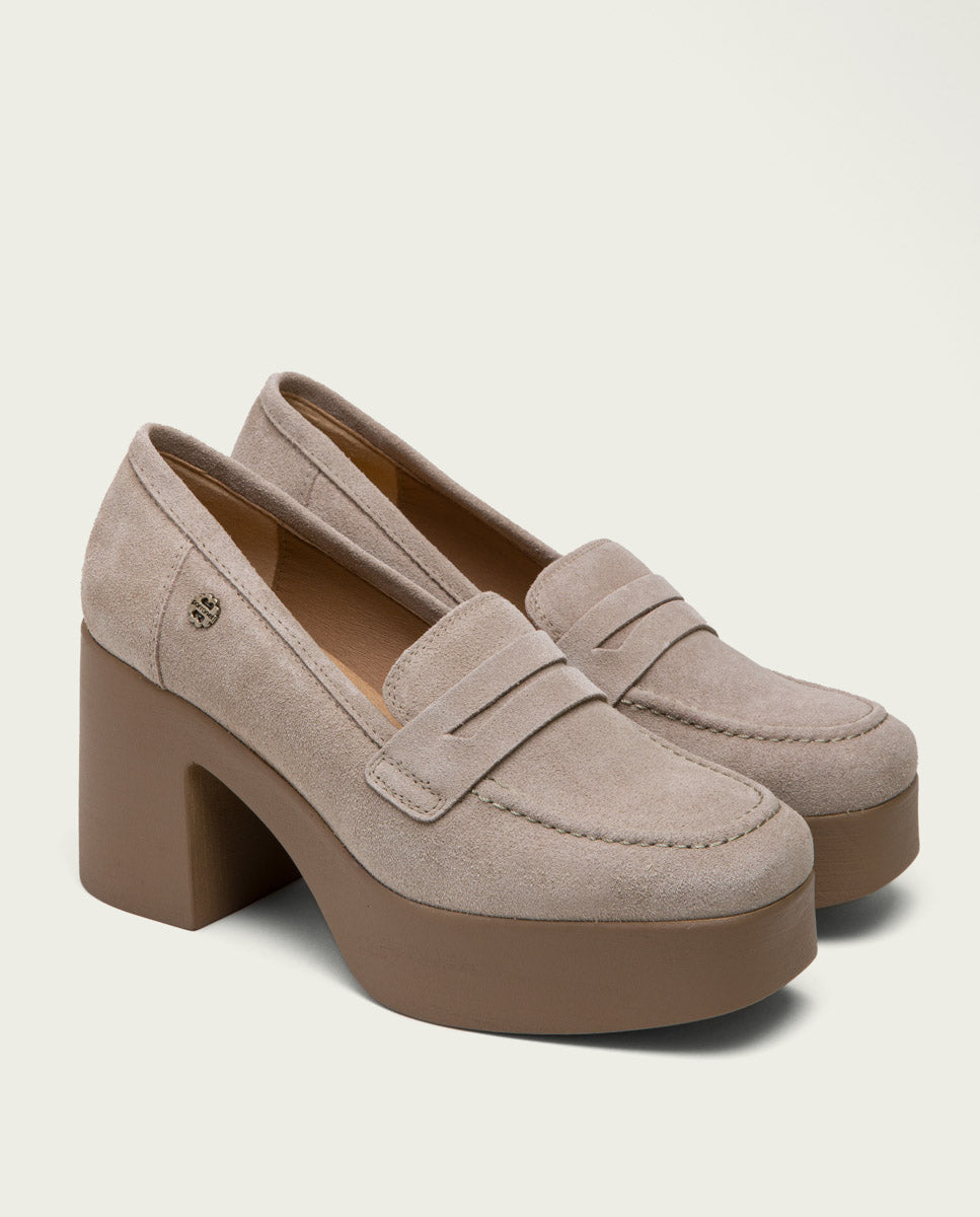 Mocasines de serraje con tacón de 8,5 cm y plataforma de 2,5 cm. Corte de serraje, plantilla y forro de microfibra con acabado confort. Piso antideslizante y flexible. Elaborado 100% en España.